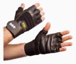 Guantes para levantamiento de pesas, confeccionado en cuero y tela polyéster, con muñequera, el cuál presenta un excelente equilibrio entre agarre y duración apto para no lesionarse, además de ayudar a levantar peso.