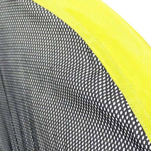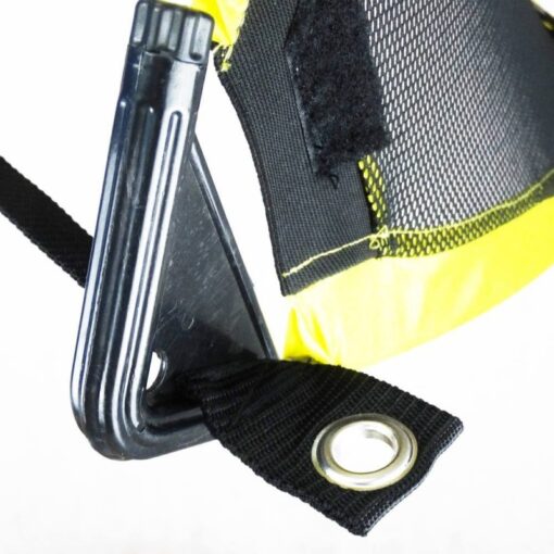 Correas de nylon impermeable amarillas de 5 cms ancho, conectadas en cada extremo con anillos de metal y anclaje.